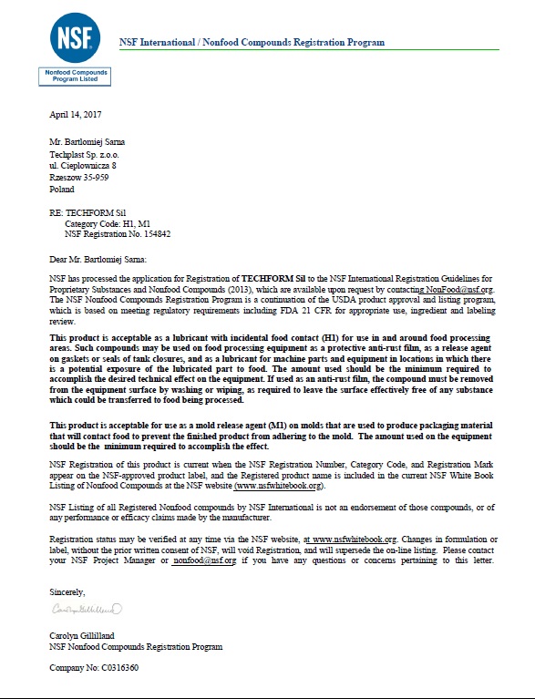 2. Our preparation - TECHFORM Sil has successfully passed the NSF certification process. We have NSF certification for this product in two categories: H1 and M1.